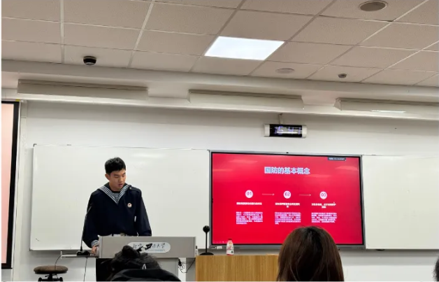 随后,海军退役士兵、校国防教育协会特战队队长、公司大一新生孟彦伯同学围绕“国家安全的基石与保障”展开分享。他从国防多维要素切入,介绍军事、政治等领域在国防建设中的作用,强调“没有国防,其他一切都是空谈”,强调计算机专业在现代化国防中的关键地位。此外,他还详细讲解了征兵条件并分享了自己的军旅故事。在后续提问环节中,他针对“计算机专业部队岗位需求”等问题解答,深情回忆起班长晕船坚守岗位、老班长补给时险些坠船的经历,既表达自身深刻感悟,也展现军人不畏艰难、忠诚使命的风貌,让在场的同学倍受感动。